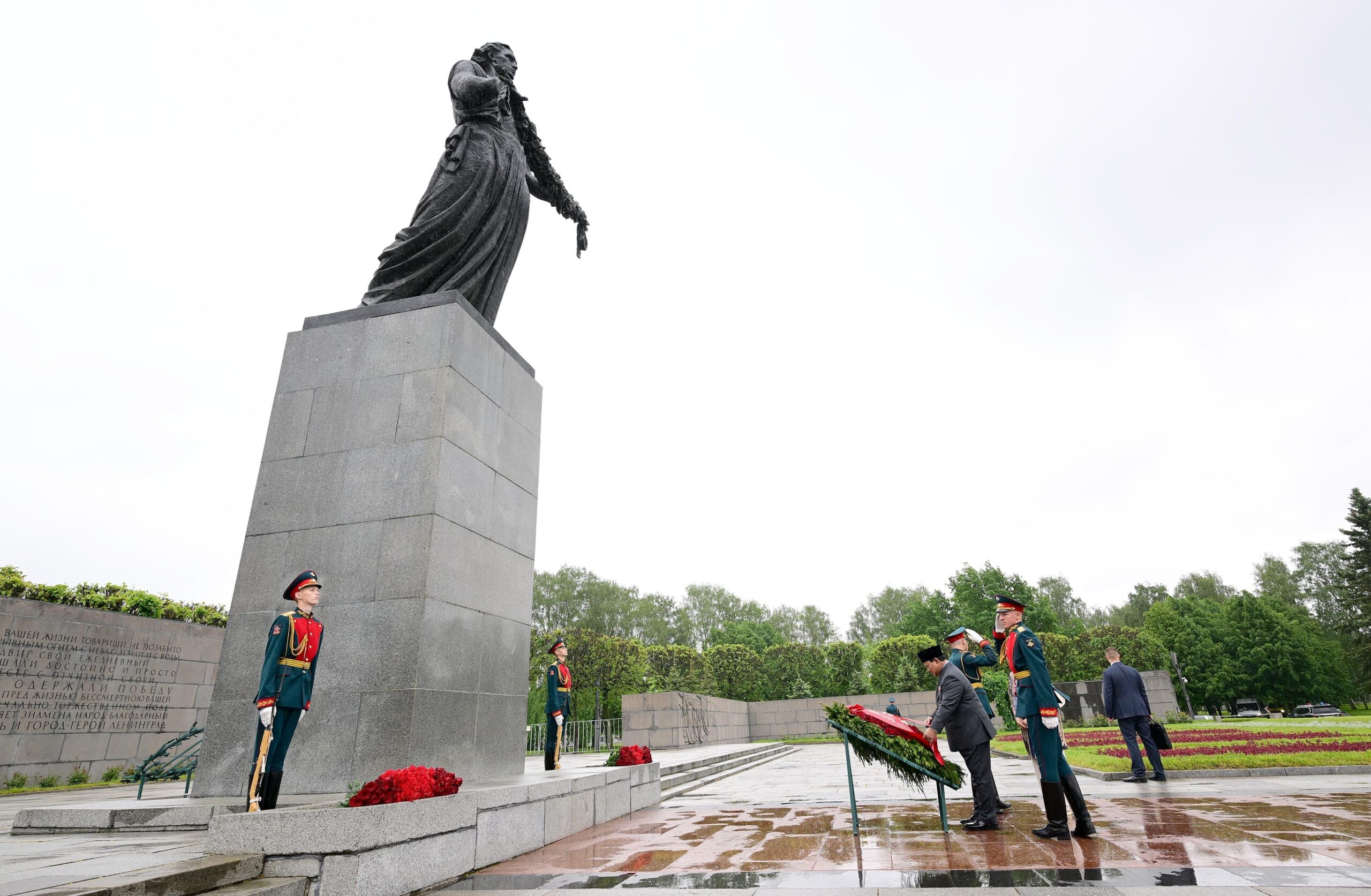 Presiden Prabowo tiba di lokasi upacara dan disambut oleh perwakilan tinggi Pemerintah Rusia. Sesuai protokol militer, Presiden Prabowo kemudian diarahkan menuju titik peletakan karangan bunga.