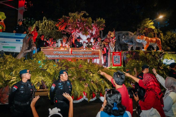 Menteri Kehutanan Raja Juli Antoni, Wakil Menteri Kehutanan Sulaiman Umar berada di atas Kendaraan hias tersebut bersama Menteri Lingkungan Hidup/Kepala Badan Pengendalian Lingungan Hidup Hanif Faisol Nurofiq dan Wakil Menteri Lingkungan Hidup Diaz Hendropriyono yang melaju dari Silang Monas hingga Simpang Semanggi, Jakarta, pada 17 Agustus 2025.