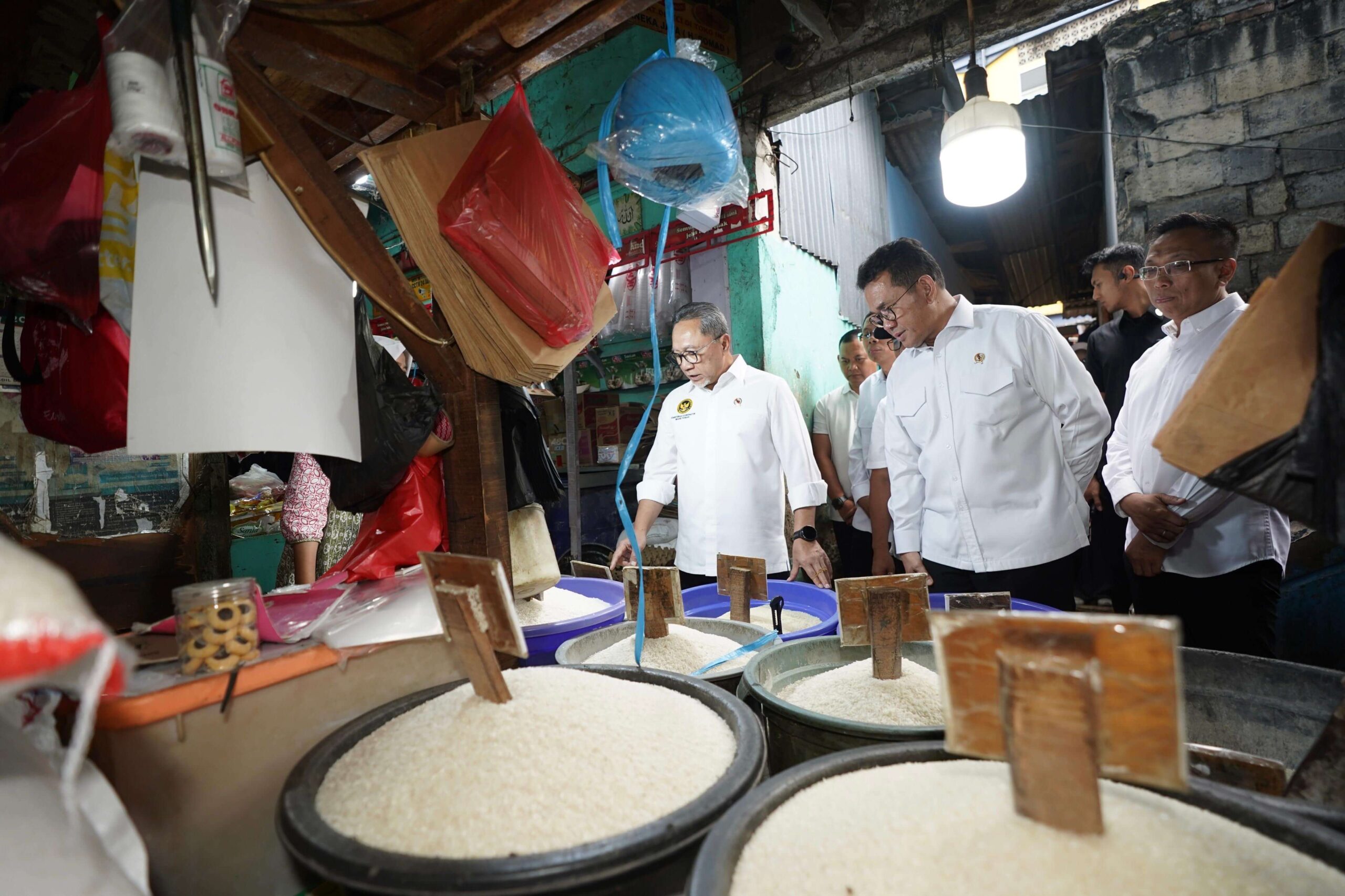 NASIONAL (BP) – Menteri Perdagangan, Budi Santoso bersama Menteri Koordinator Bidang Pangan, Zulkifli Hasan meninjau ketersediaan dan harga barang kebutuhan pokok (bapok) di Pasar Minggu, Jakarta, Sabtu (28 Mar).