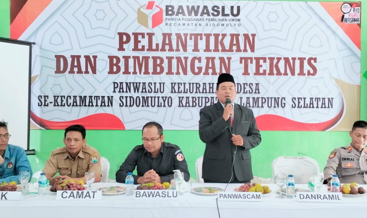 ” Tugas Pengawasan di tingkat Kelurahan desa kami percayakan kepada kalian karena kami yakin kalian mampu dan merupakan orang-orang pilihan setelah melalui berbagai tahapan hingga dilantik dan di ambil sumpah nya hari ini dan kami berharap kedepannya dapat menjadi pengawas di Kelurahan/Desa masing-masing dengan penuh tanggung jawab.”Tegas Ketua Panwaslu Kecamatan Sidomulyo.