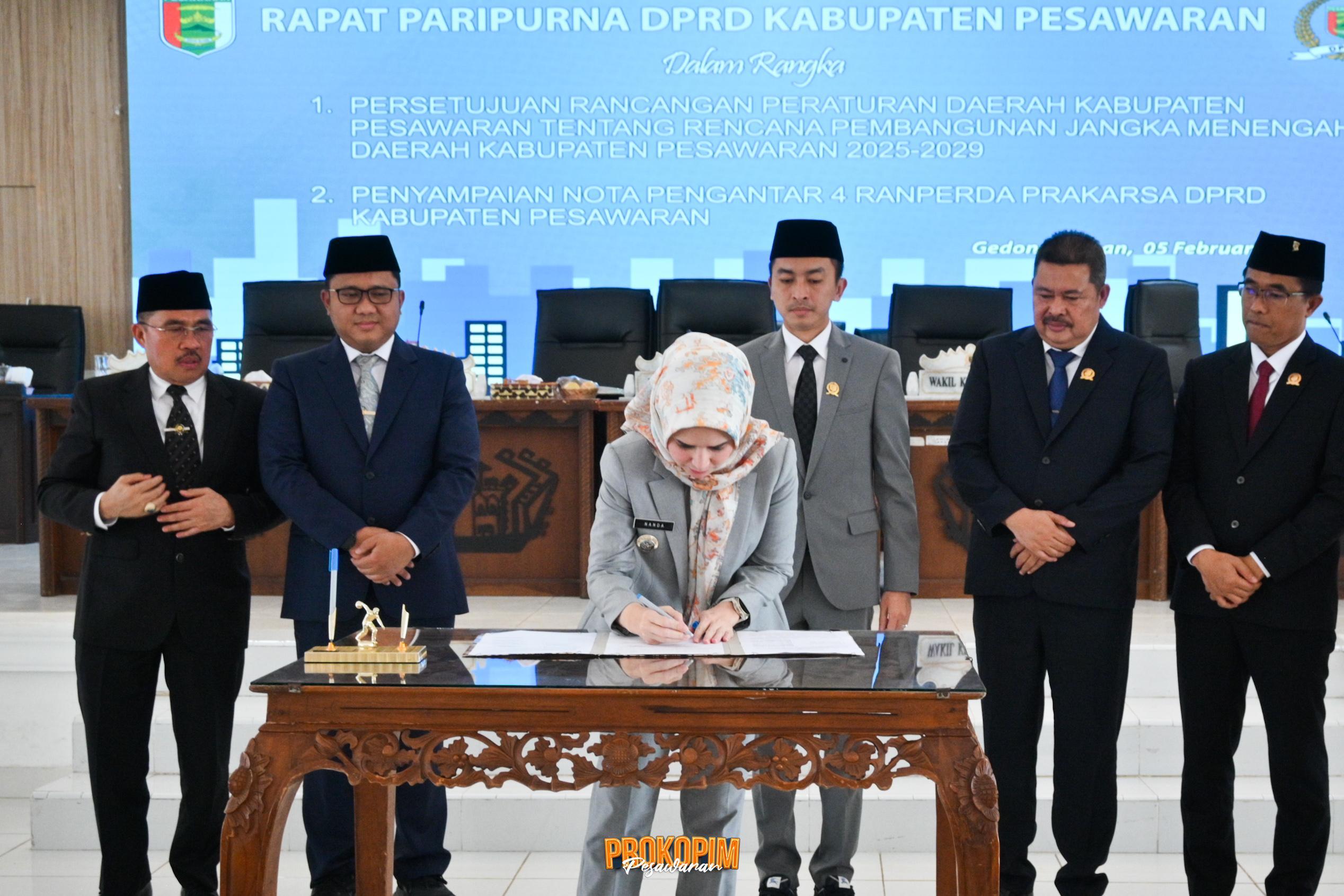 Dalam agenda persetujuan Ranperda RPJMD, laporan pembahasan disampaikan oleh Badan Pembentukan Peraturan Daerah (Bapemperda) DPRD Kabupaten Pesawaran, dilanjutkan dengan penandatanganan nota kesepahaman bersama antara DPRD dan Pemerintah Daerah, serta sambutan Bupati Pesawaran. Bapemperda menyampaikan bahwa Ranperda RPJMD pada prinsipnya layak dan dapat disetujui untuk selanjutnya ditetapkan menjadi Peraturan Daerah.