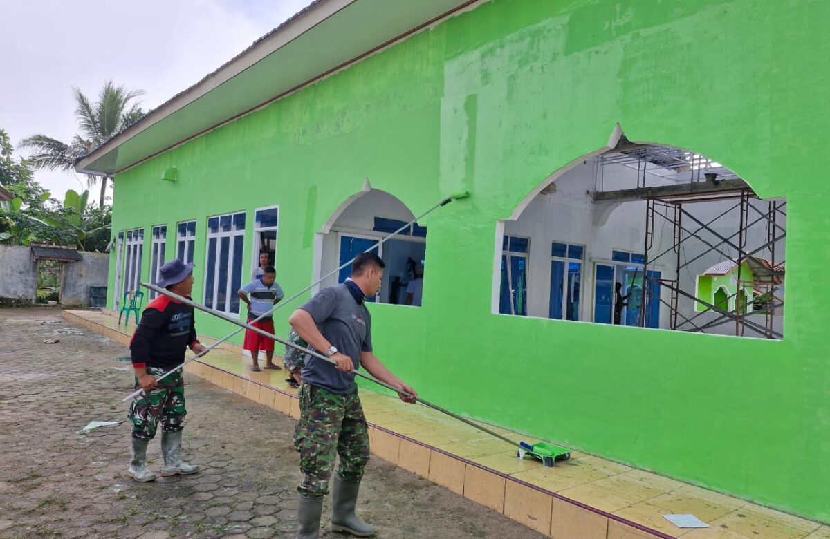 Dihari akhir pelaksanaan kegiatan TMMD, warga bersama satgas TMMD melakukan pengecatan masjid untuk menyelesaikan rehab rumah ibadah.