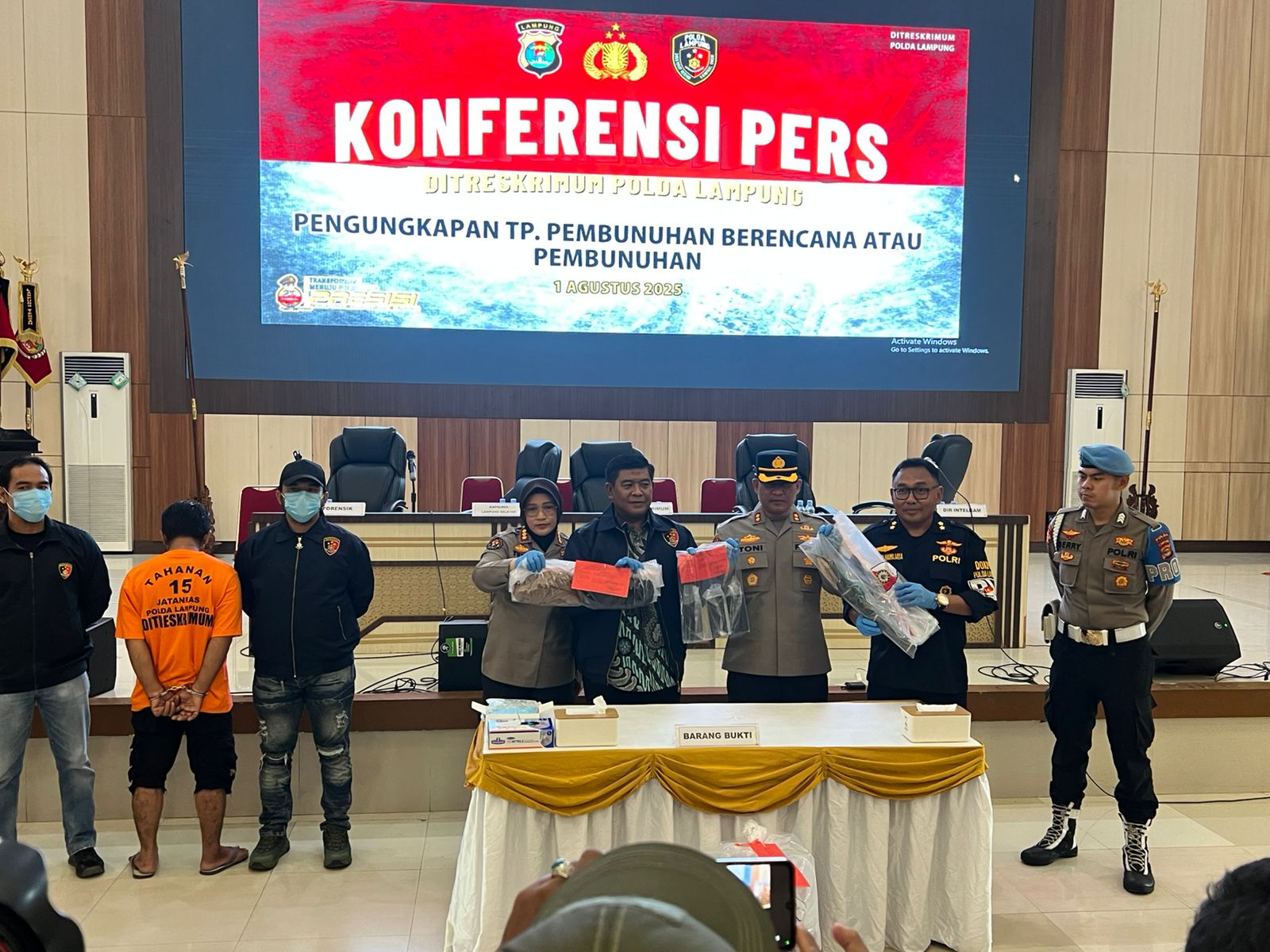 Lampung Selatan (BP) – Polda Lampung berhasil mengungkap kasus pembunuhan berencana terhadap seorang pegawai koperasi yang jasadnya ditemukan di aliran sungai kawasan Natar, Lampung Selatan. Kapolres Lampung Selatan AKBP Toni Kasmiri turut mendampingi Dirreskrimum Polda Lampung Kombes Pol Indra Hermawan saat konferensi pers pengungkapan kasus, Jumat (1/8/2025) di Gedung Serba Guna Polda Lampung.