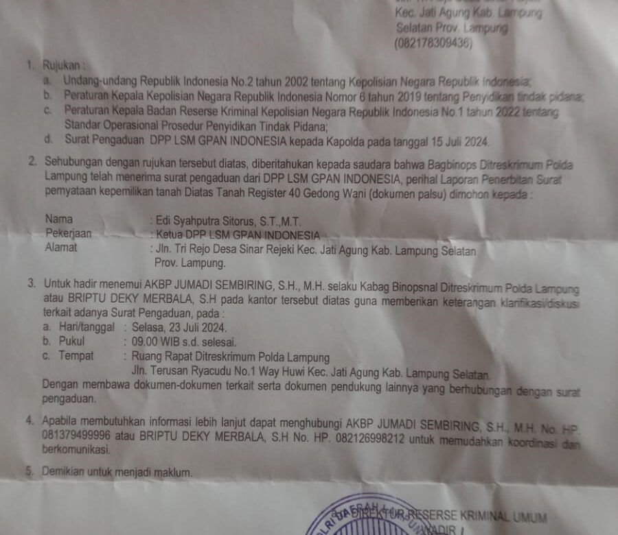 Terbitnya surat kepemilikan tanah yang tidak mempunyai dasar hukum dan aturan yang jelas dilaporkan DPP LSM GPAN Indonesia ke POLDA Lampung melalui surat nomor. 053/DPP-GPAN/VII/2024 pada 15 Juli 2024 diterima Sekretariat Umum Polda Lampung, 18/07/2024 ujar Eddy Ketum DPP LSM GPAN Indonesia kepada  awak media.