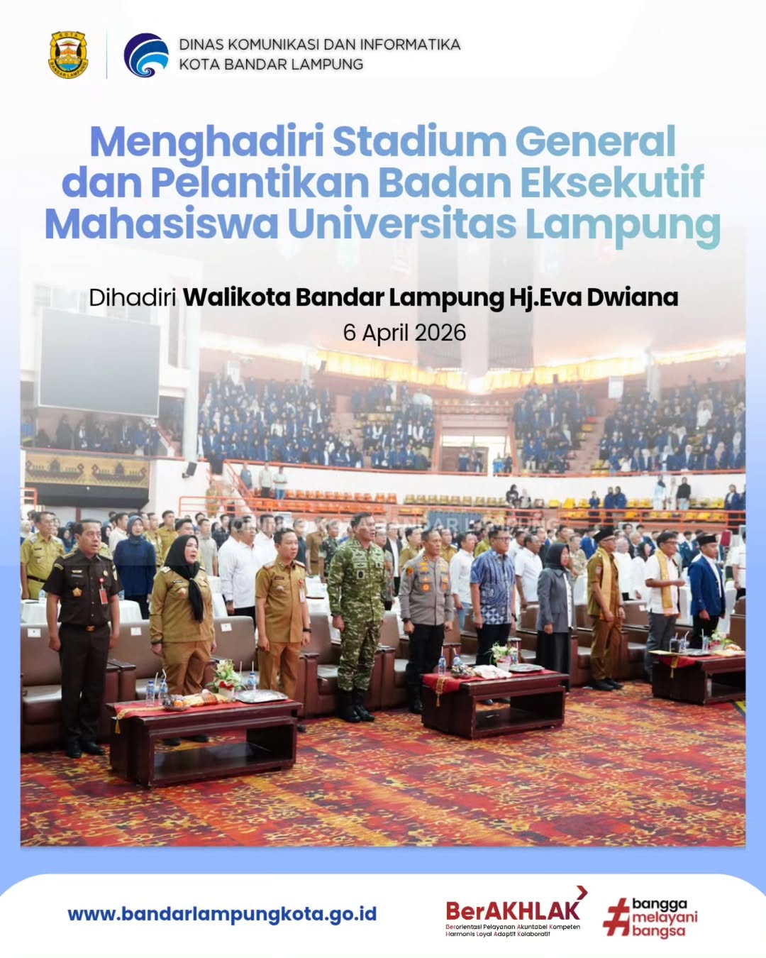 Bandar Lampung (BP) – Wali Kota Bandar Lampung, Hj. Eva Dwiana menghadiri kegiatan Studium General sekaligus pelantikan Badan Eksekutif Mahasiswa Universitas (BEM U) Keluarga Besar Mahasiswa Universitas Lampung yang digelar di Gedung Serbaguna Universitas Lampung. Senin (6/4/2026). (8/4/2026)
